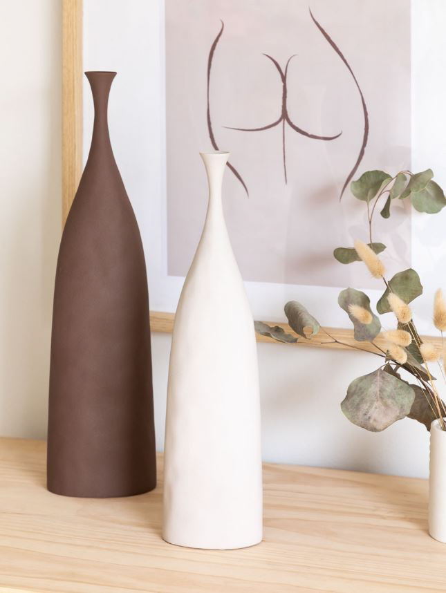 2 tall artisan ceramic vases, white and e
